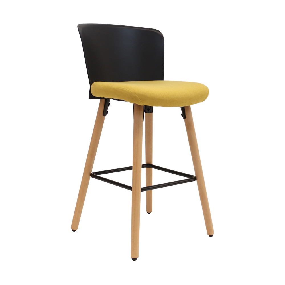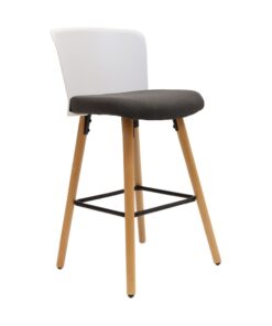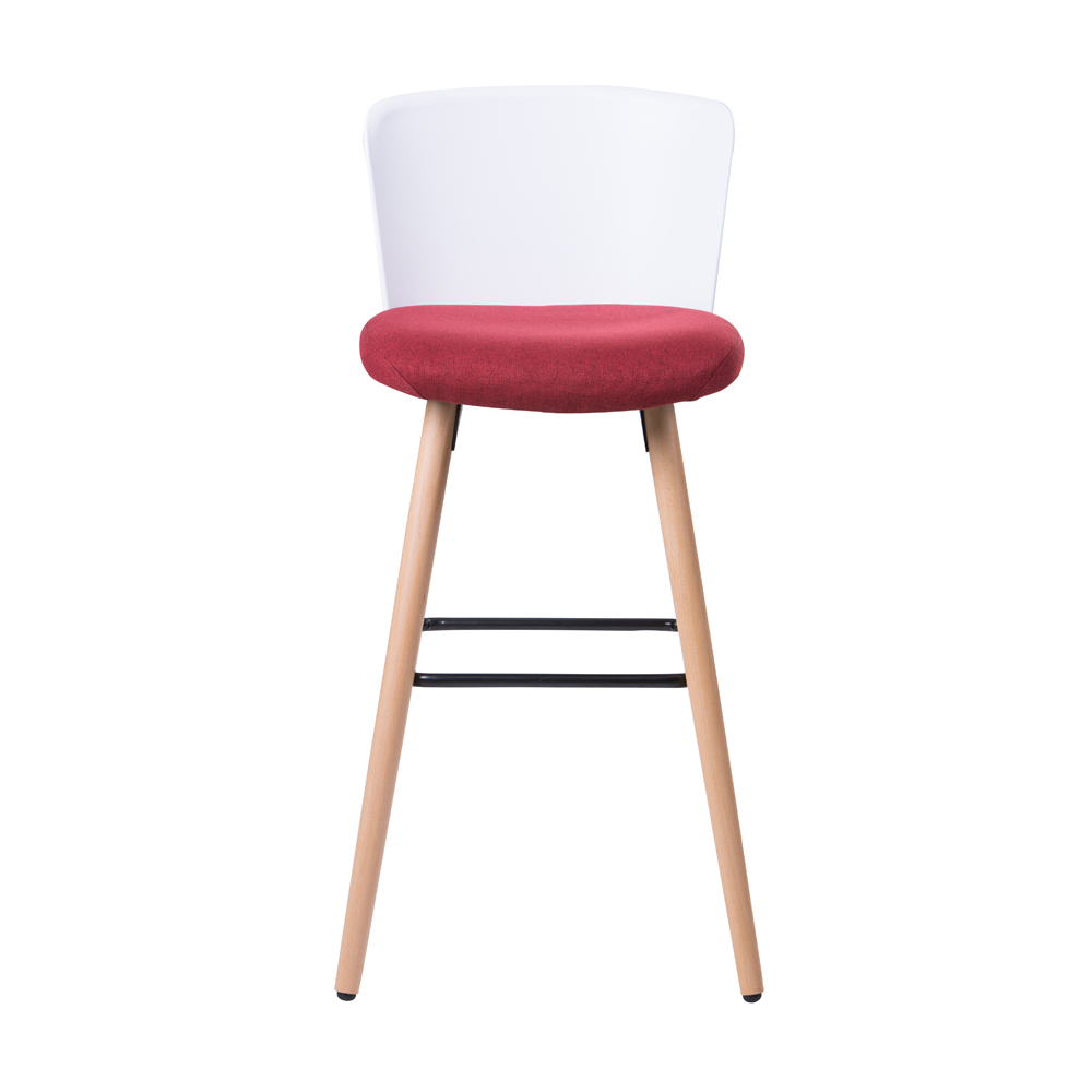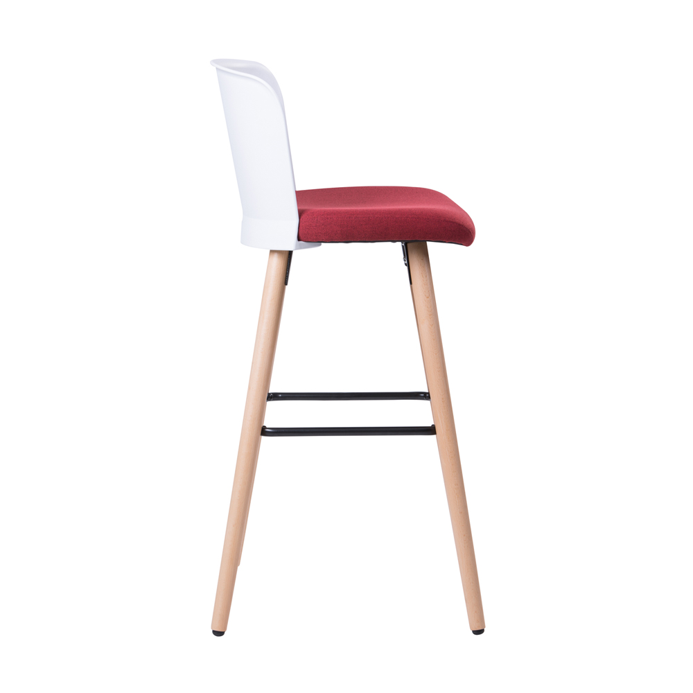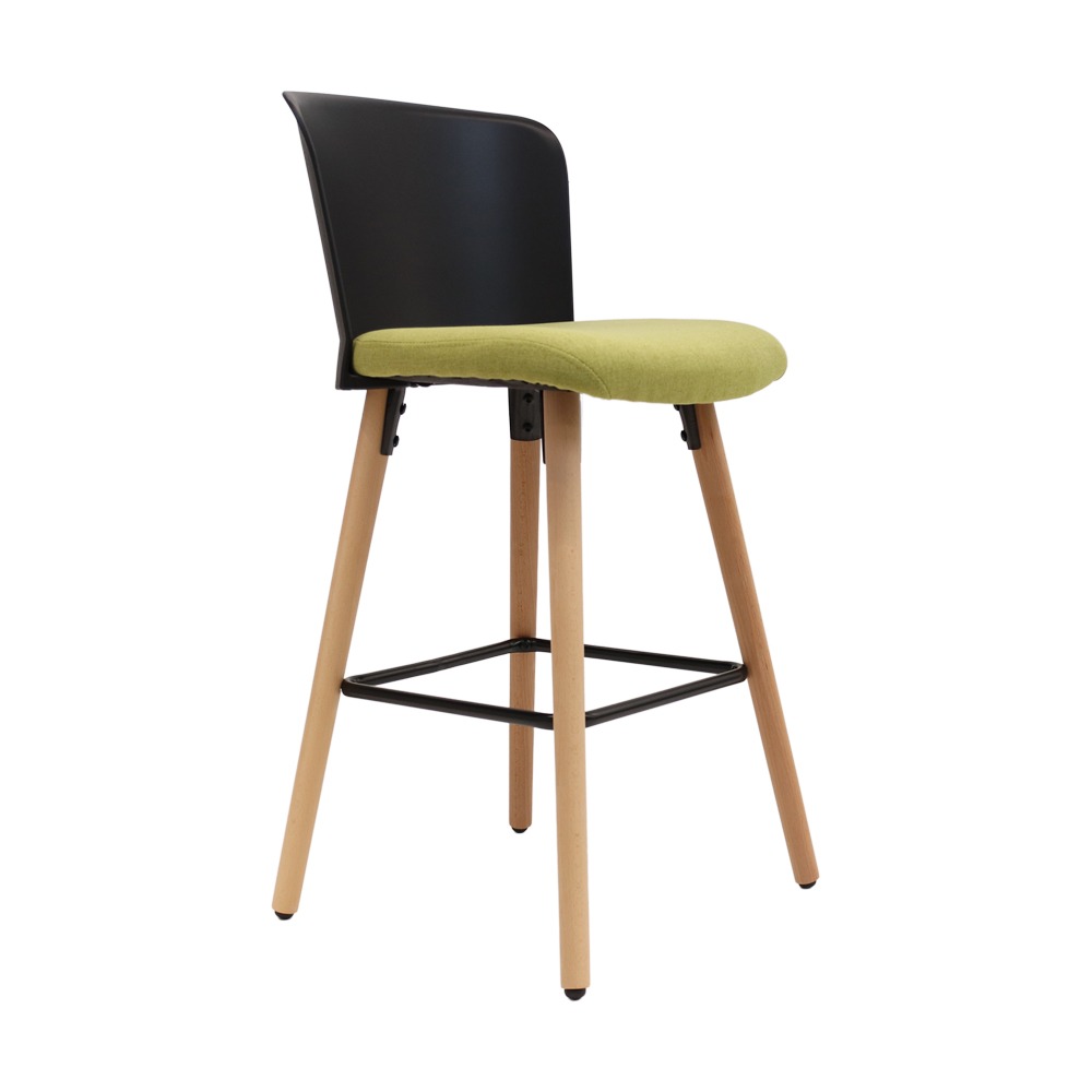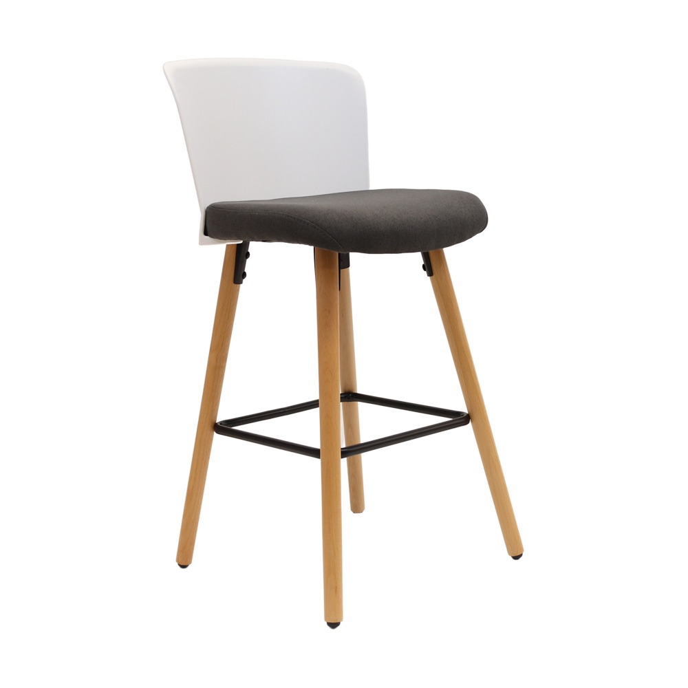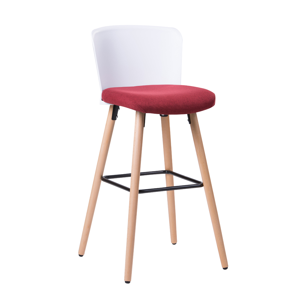 כסא בר בעיצוב מודרני, גב פלסטיק, מושב ריפוד בד, רגלי עץ טבעי