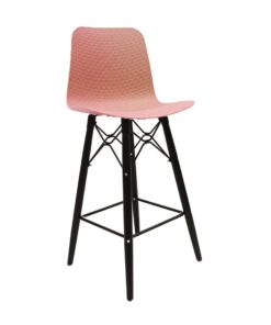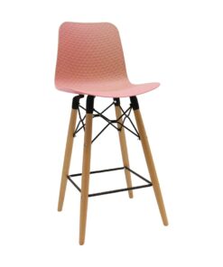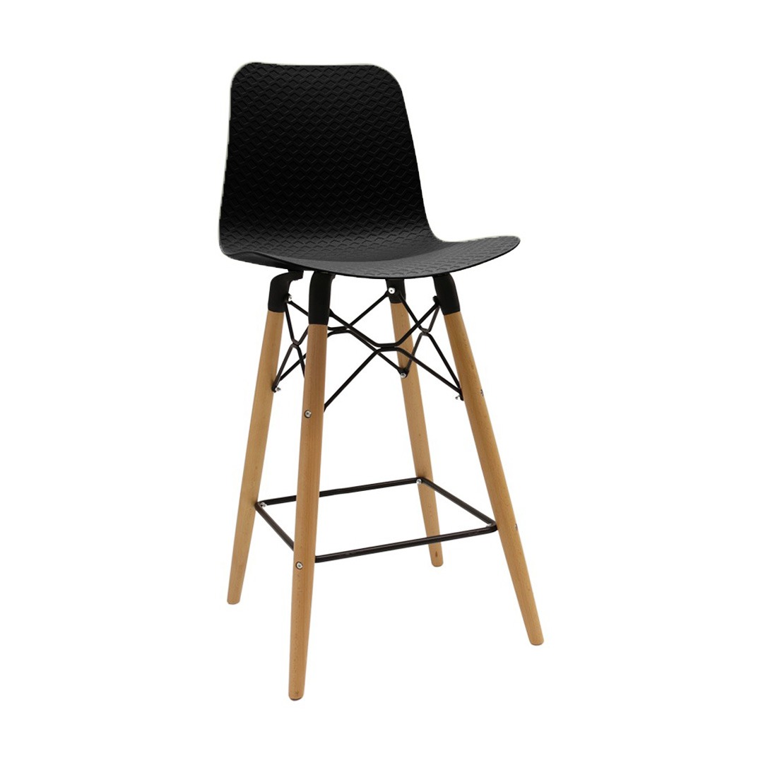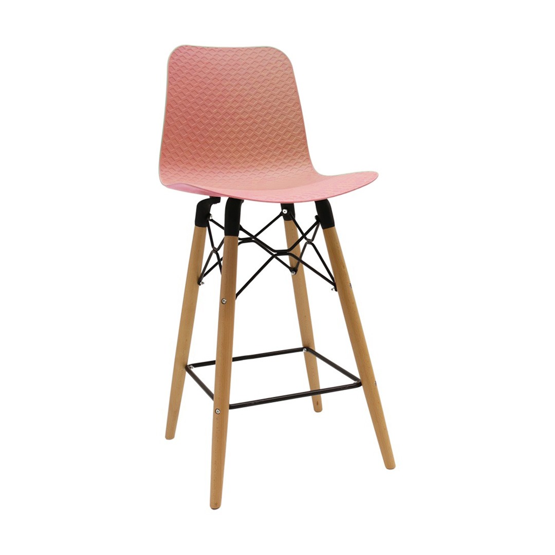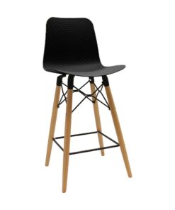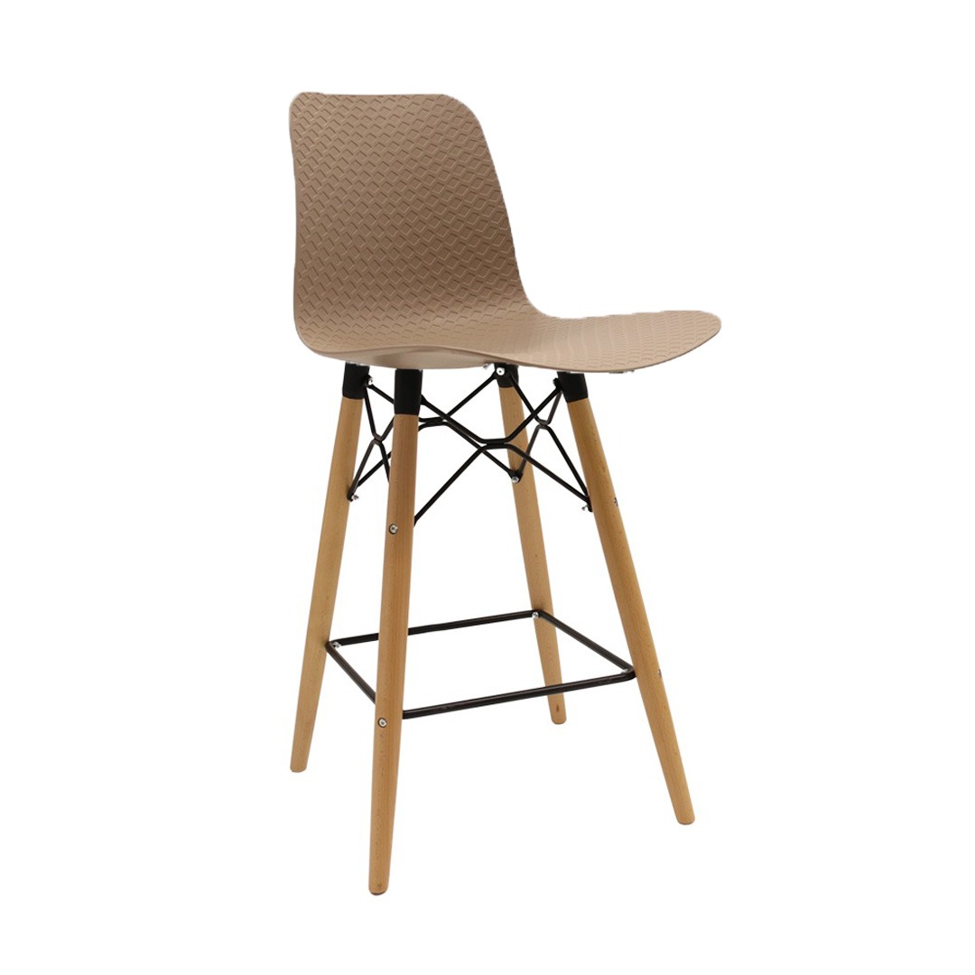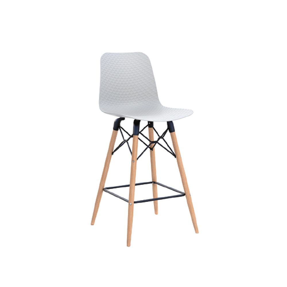כסא בר מעוצב, מושב פלסטיק, שלד עץ 4-רגליים עם מסגרת מתכת למנוחת הרגליים