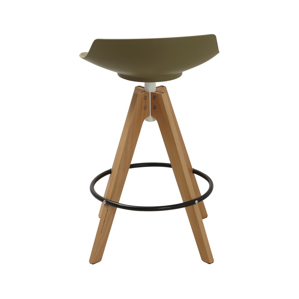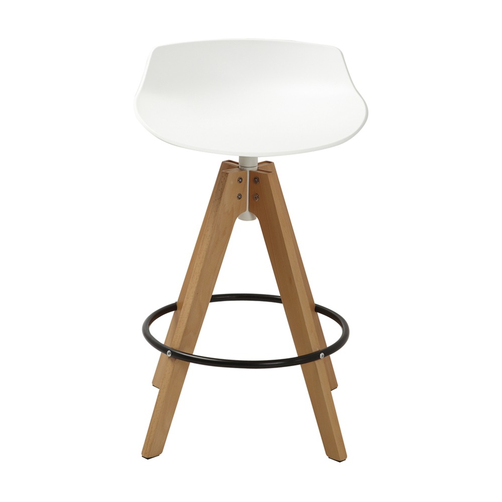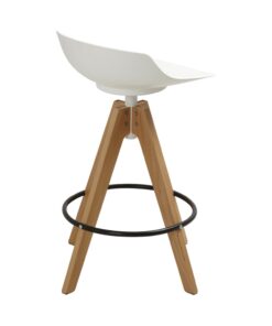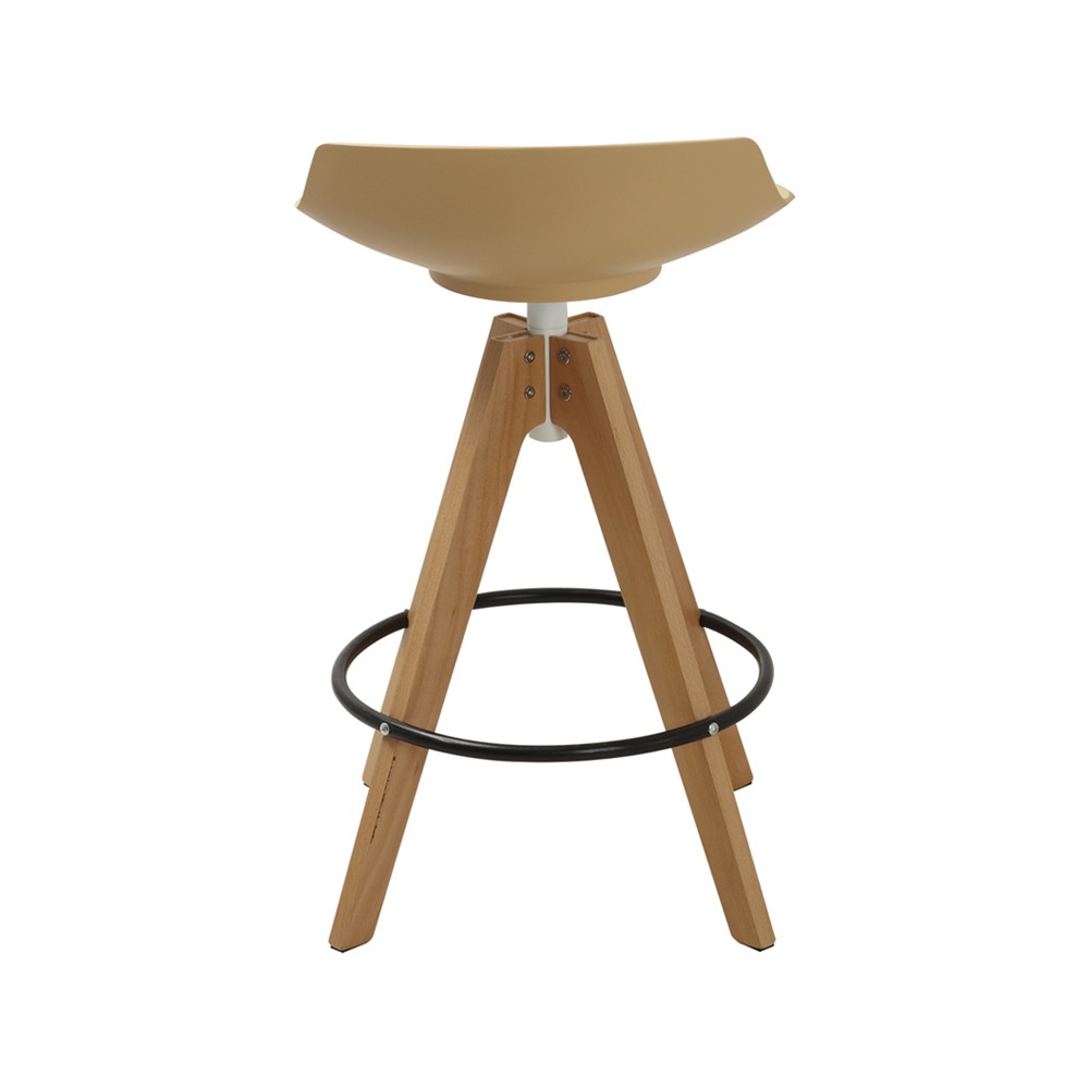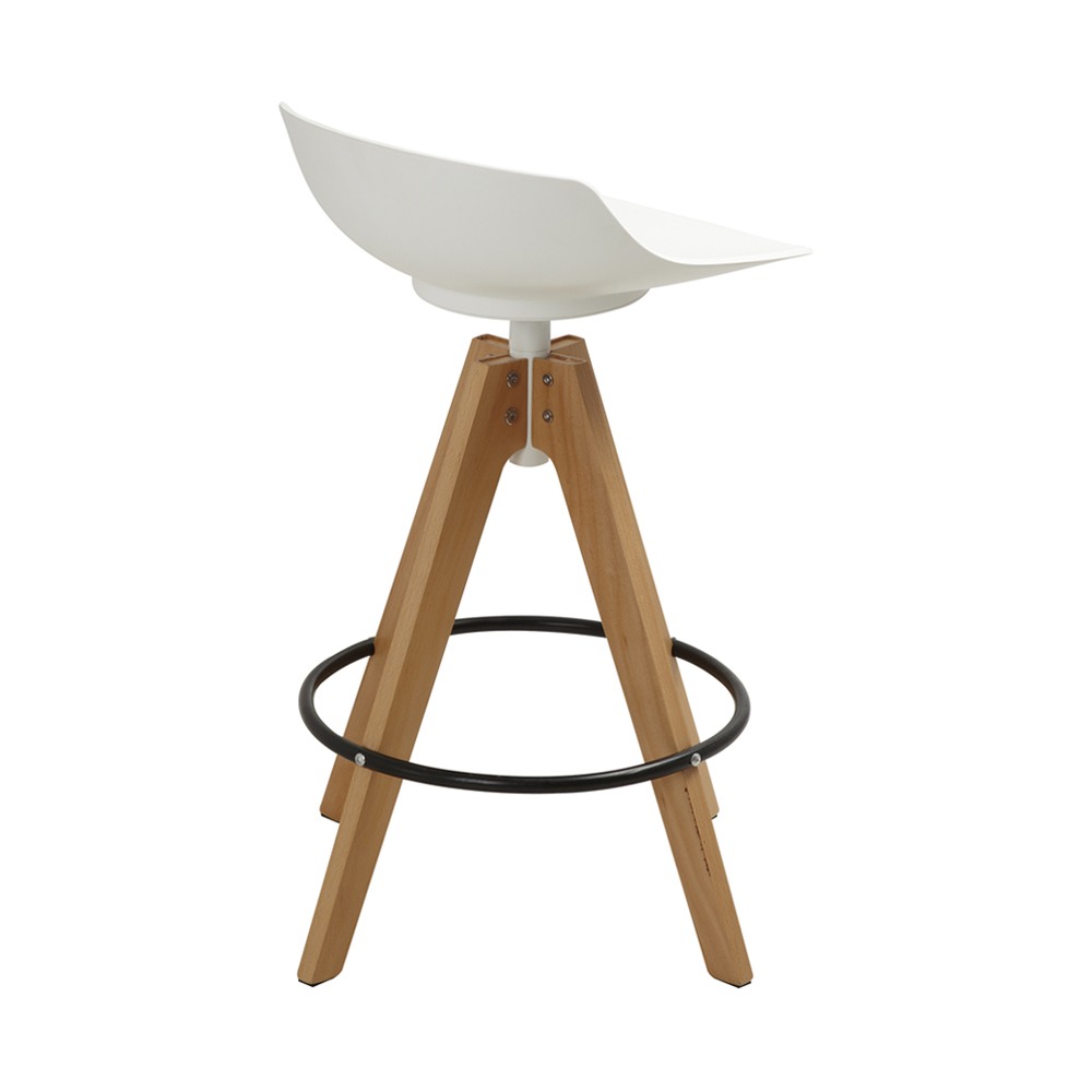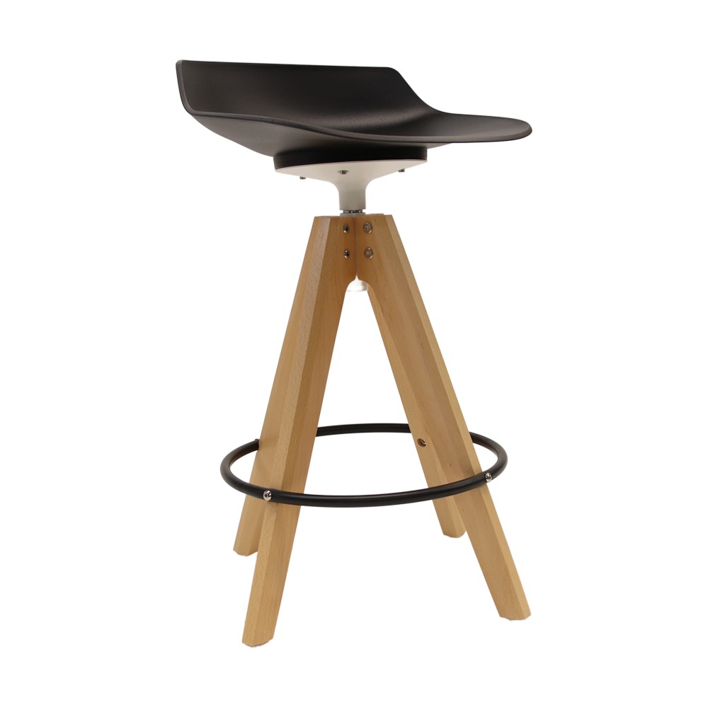כסא בר מעוצב, מושב פלסטיק, רגלי עץ עם חישוק לרגליים