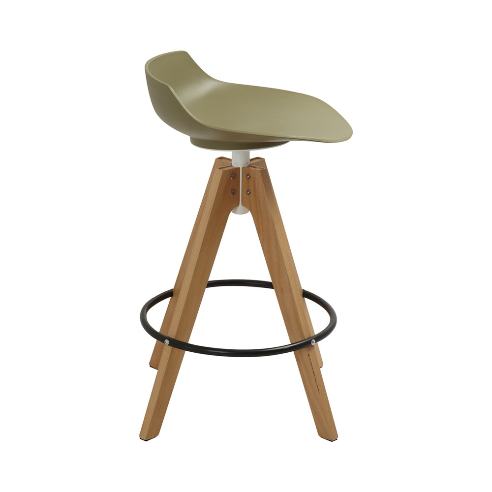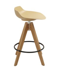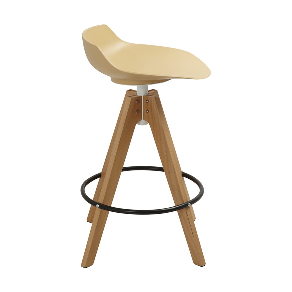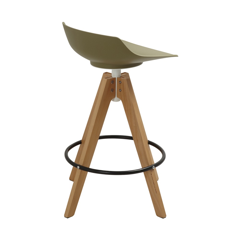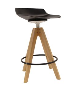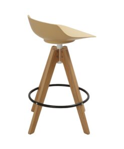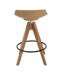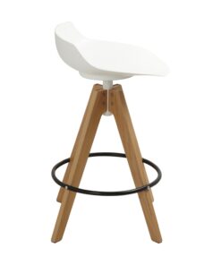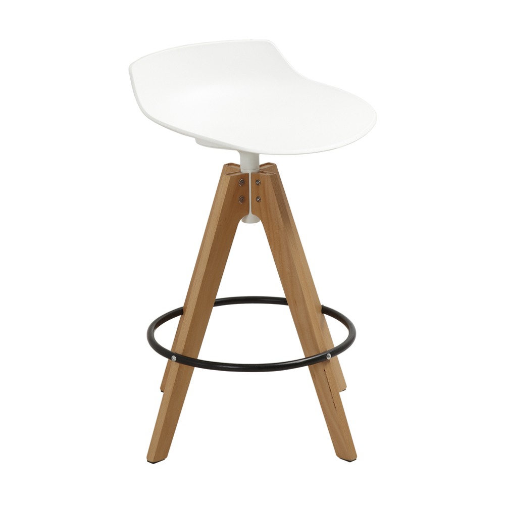 כסא בר מעוצב, מושב פלסטיק, רגלי עץ עם חישוק לרגליים