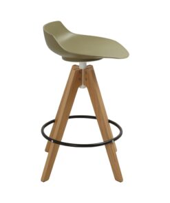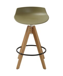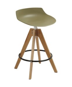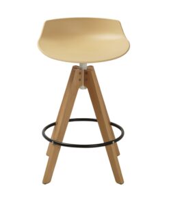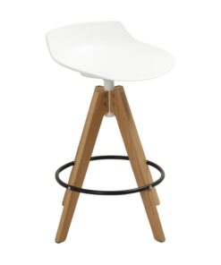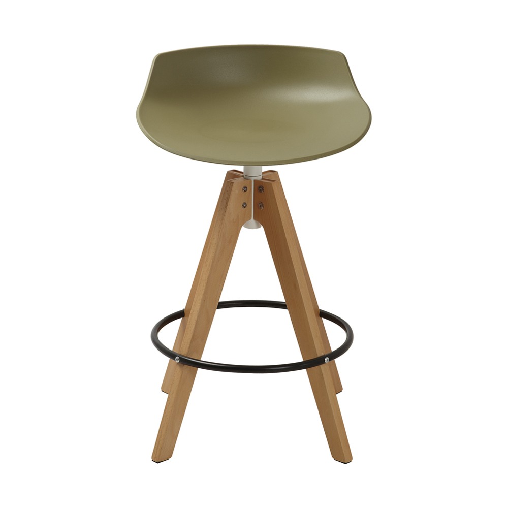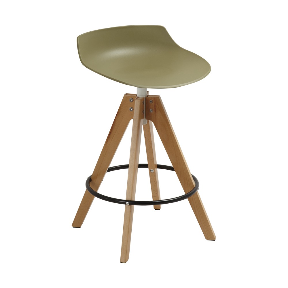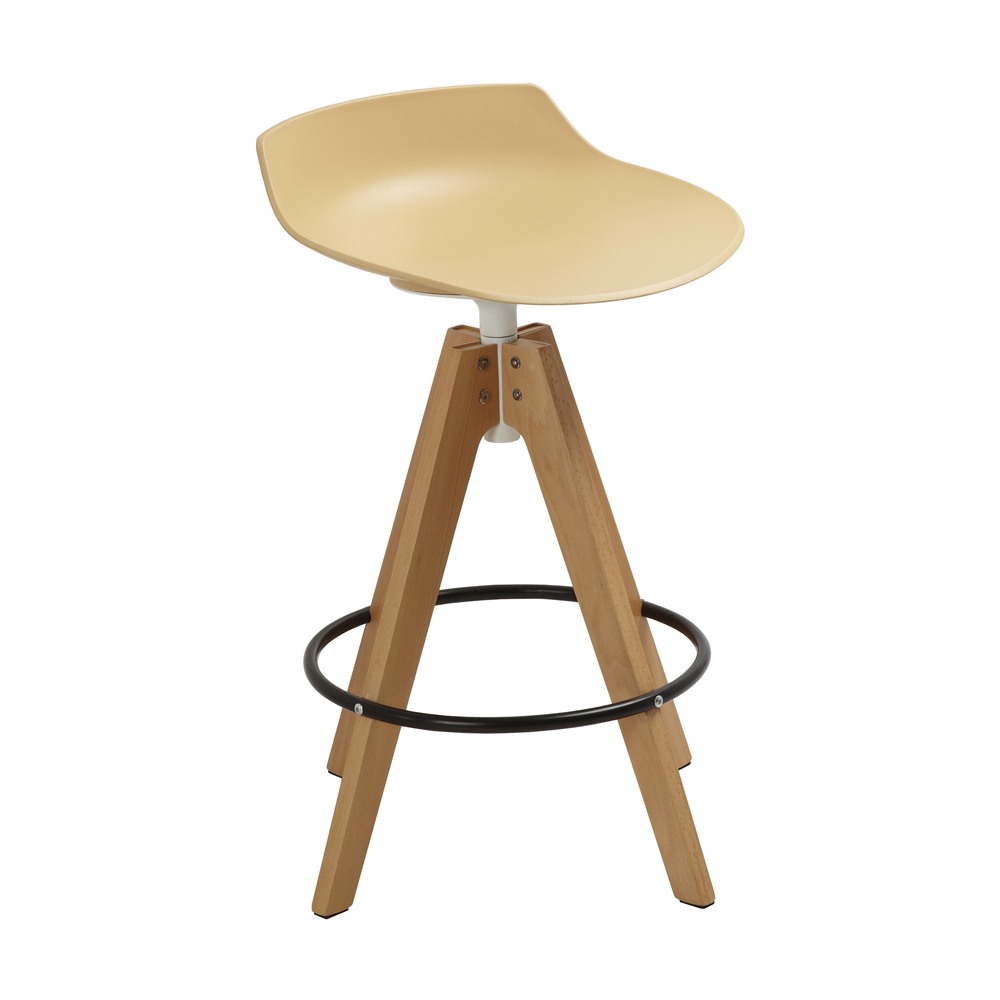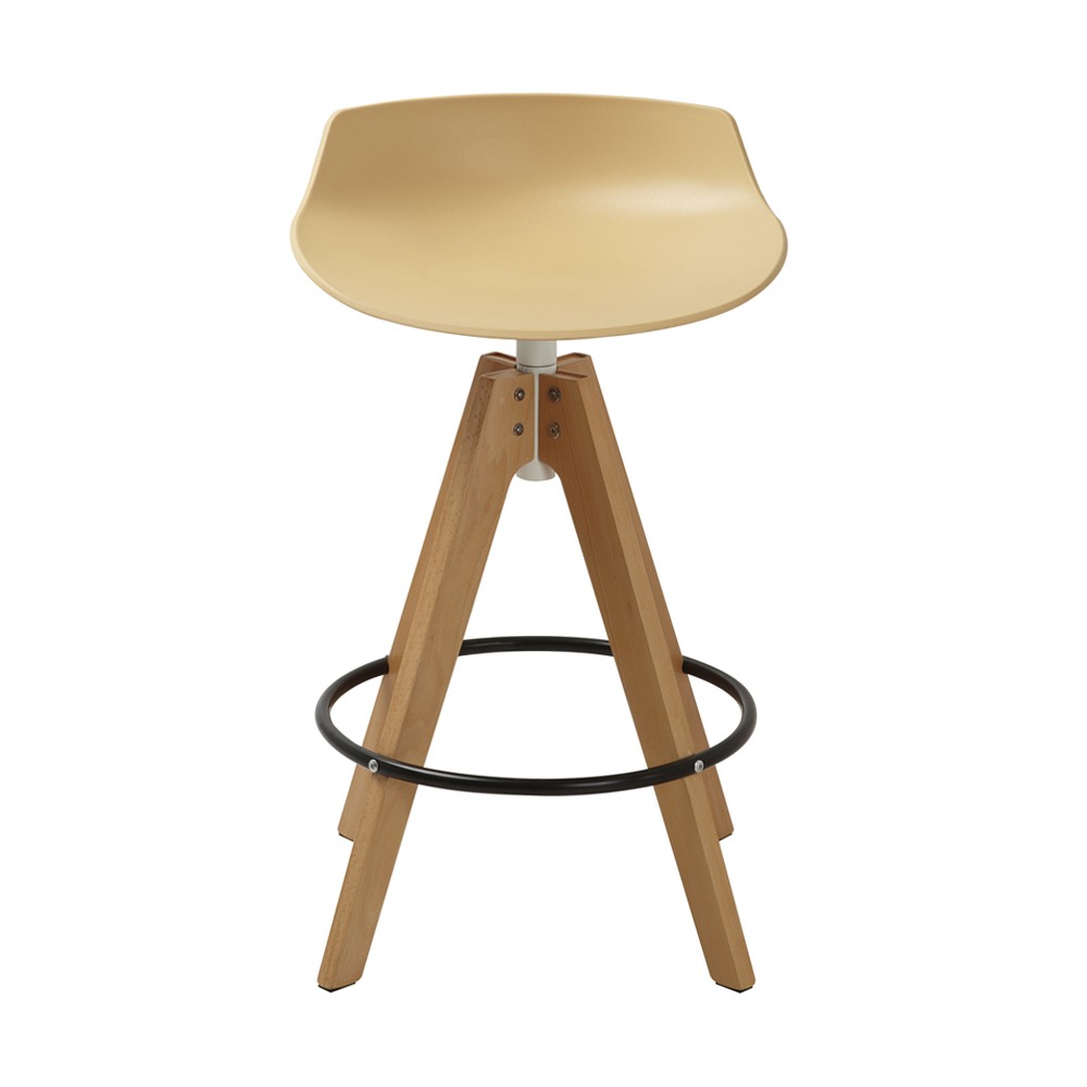 כסא בר מעוצב, מושב פלסטיק, רגלי עץ עם חישוק לרגליים